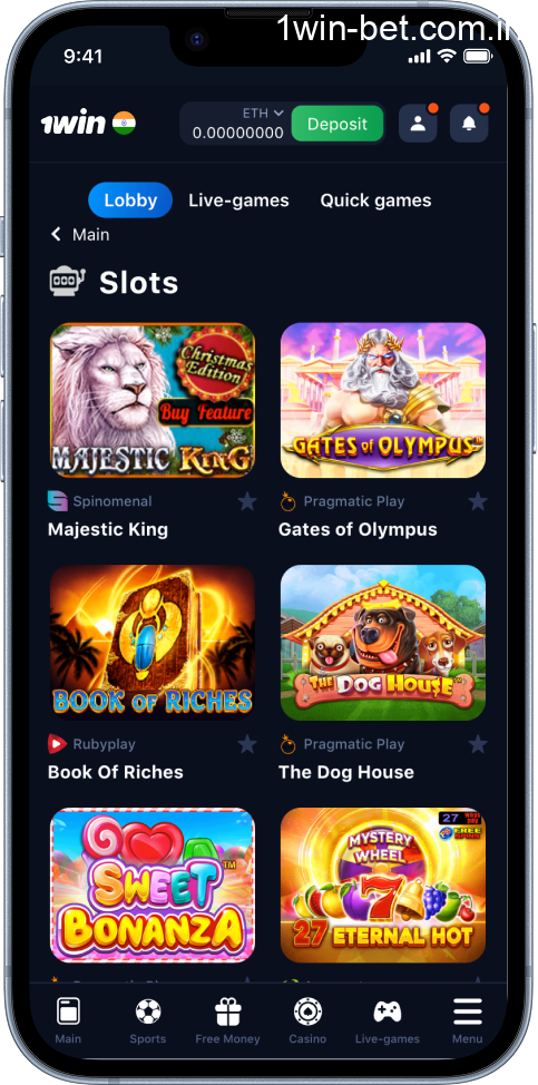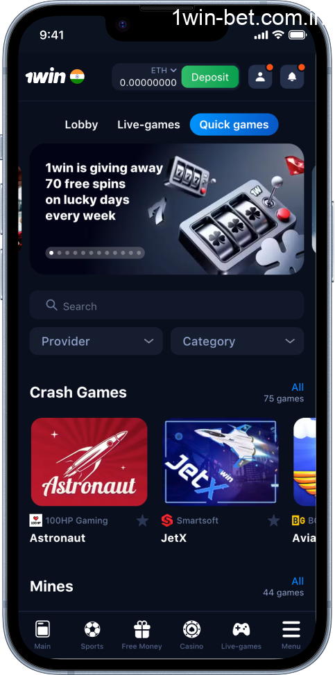 You can open the Casino tab in the 1win app and get access to the full game collection right from your phone. The application has over 13,000 games. Most Indian players go for slots, but you’ll find crash games and live games as well. Use the bottom menu or the top bar to switch tabs fast. Here’s what’s included: